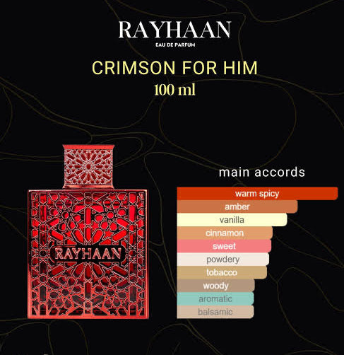 Crimson by Rayhaan is a men's fragrance characterized by its warm and spicy profile. The scent opens with vibrant notes of cinnamon, cardamom, and pink pepper, leading into a heart of patchouli and heliotropin. The base is composed of benzoin, vanilla, and tonka bean, contributing to its depth and longevity.